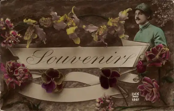 Ak Souvenir, französischer Soldat in Uniform, Blumen