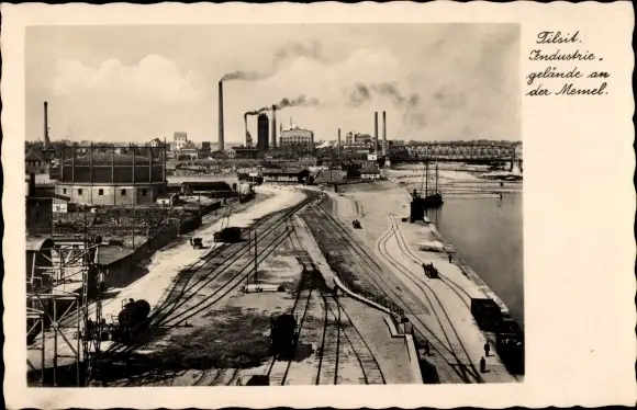 Ak Sowjetsk Tilsit Ostpreußen, Industriegelände an der Memel, Bahngleise