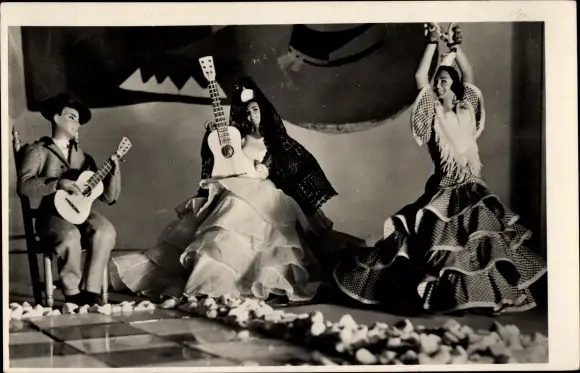 Ak Spaansche Dansgroep, Puppen in spanischen Trachten, Tänzerin