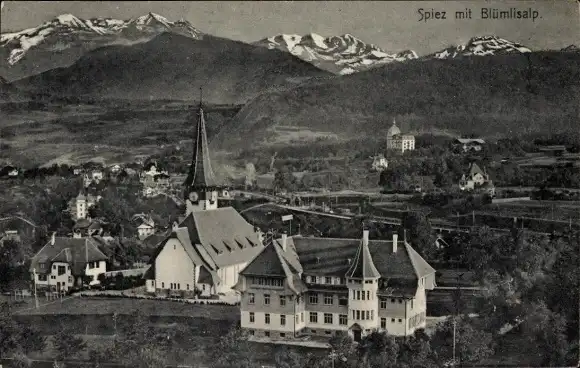 Ak Spiez Kanton Bern, Blick auf die Stadt mit Blümlisalp