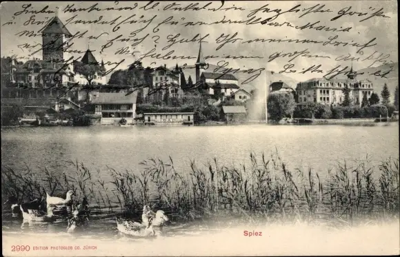 Ak Spiez am Thuner See Kanton Bern, Enten auf dem See, Stadt