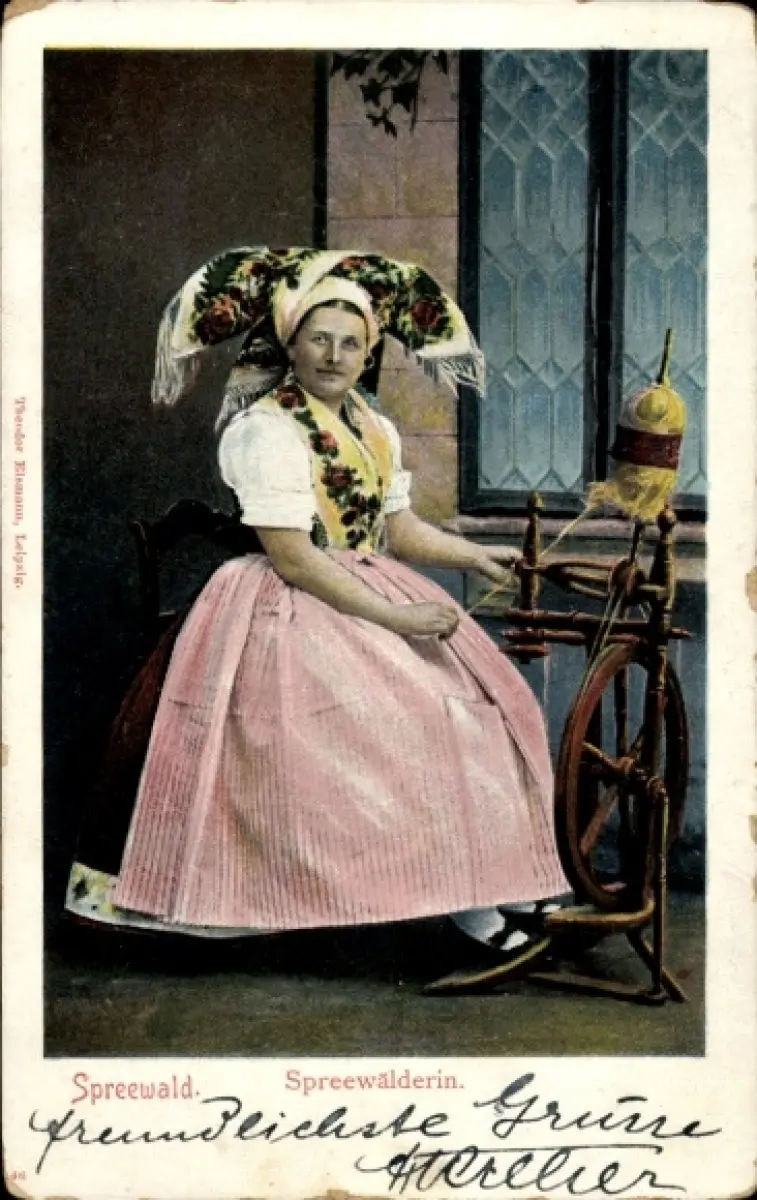 Ak Spreewälderin am Spinnrad