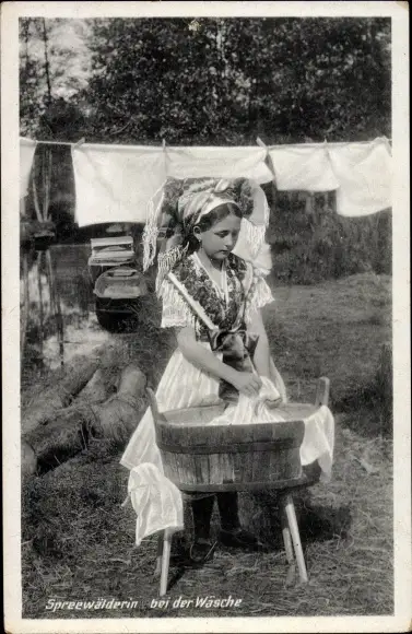 Ak Spreewälderin bei der Wäsche, Wäscheleine, Bottich