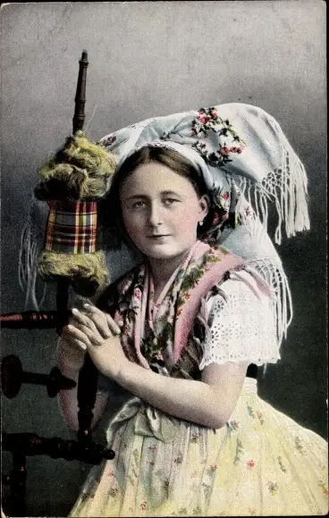 Ak Spreewälderin in Volkstracht, Spinnrad