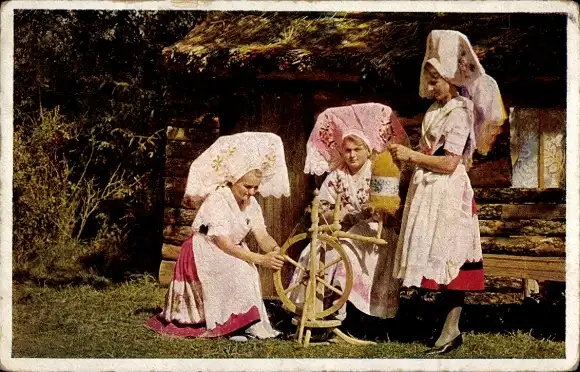Ak Spreewälderinnen in Volkstrachten mit Spinnrad
