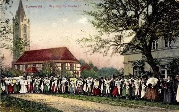 Ak Spreewald, Spreewälder in Trachten, Wendische Hochzeit, Kirche