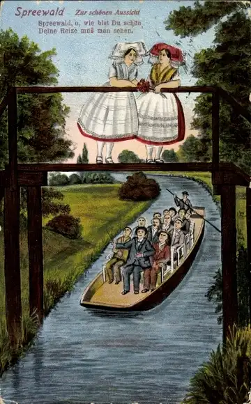 Ak Spreewald, Spreewälderin in Tracht, Zur schönen Aussicht, Kahn