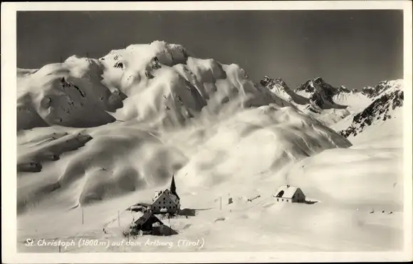 Ak St Christoph am Arlberg Tirol, Wintermotiv, Kirche, Häuser, Berge