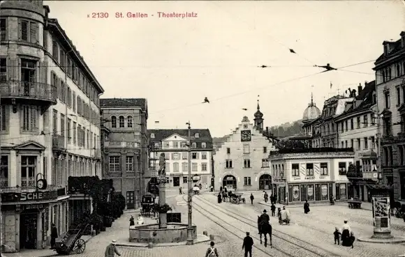 Ak St. Gallen Stadt, Theaterplatz, Brunnen, Geschäfte
