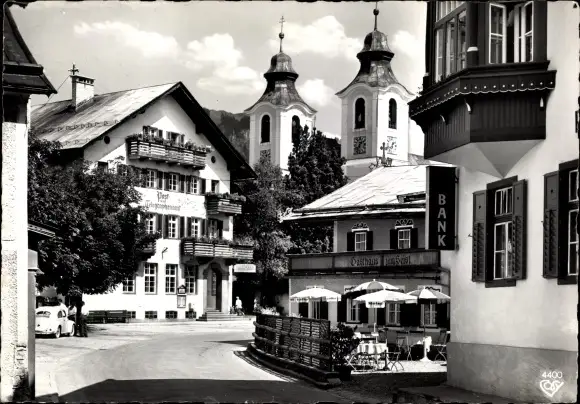 Ak St. Johann in Tirol, Straßenpartie, Bank, Gasthaus