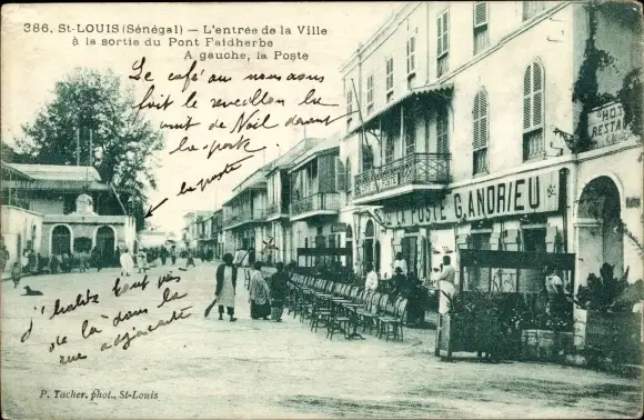 Ak St. Louis Senegal, Der Eingang zur Stadt am Ausgang von Pont Faidherbe, dem Postamt