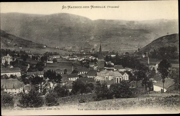 Ak St Maurice sur Moselle Vosges, vue générale du village, vallée, eglise