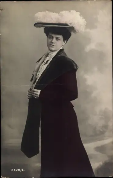 Ak Standportrait einer Frau mit Federhut und Mantel