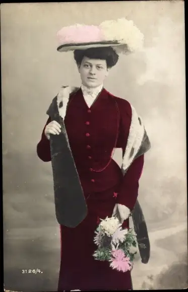 Ak Standportrait einer Frau mit Federhut und Mantel