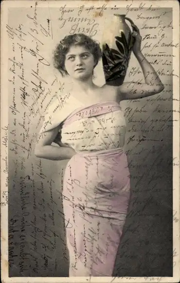 Ak Standportrait einer Frau mit Tonkrug