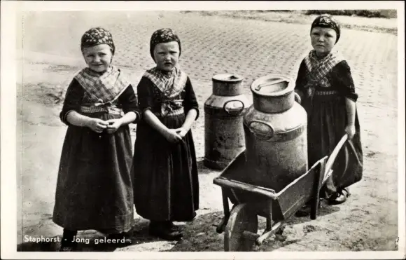 Ak Staphorst Overijsel, Jong geleerd, Junge Milchmädchen in Trachten