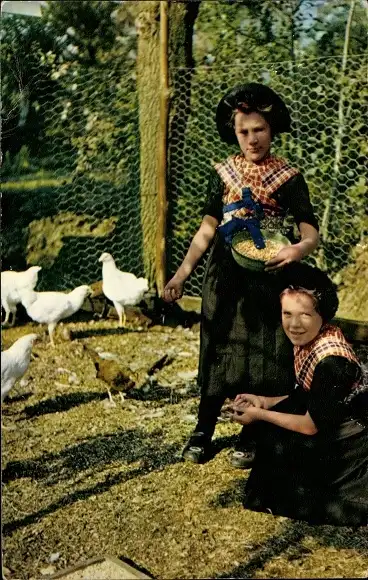 Ak Staphorst Overijssel, Mädchen in niederländischer Tracht füttern Hühner