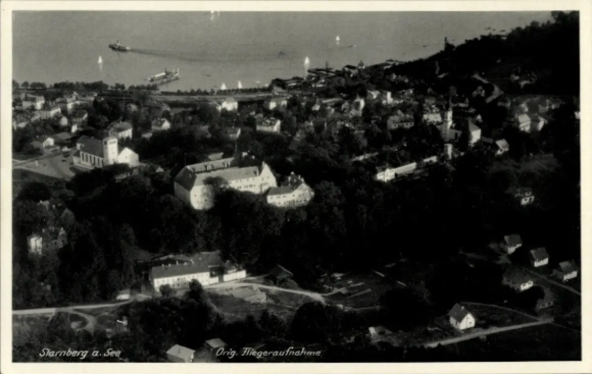 Ak Starnberg am Starnberger See Oberbayern, Luftaufnahme von Starnberg am See, Schiffe, Bäume, Hä