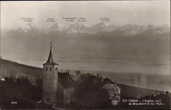 Ak Ste. Croix Kt. Waadt Schweiz, L'eglise, mer de Brouillard et les Alpes
