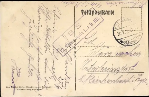 Ak Stempel Deutsche Feldpost 1. WK, 14. Landw. Div., 12. Kompagnie L. I. R. 101