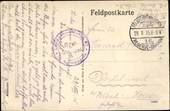 Ak Stempel Deutsche Feldpost 1. WK, 16. Reserve Division, Landwehr Inf. Regt. 87, 10. Kompagnie