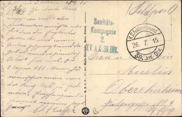 Ak Stempel Deutsche Feldpost 1. WK, 39. Inf. Div., Sanitäts Kompagnie 2, XV. AK 39. Div.
