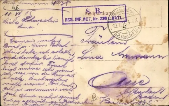 Ak Stempel Deutsche Feldpost 1. WK, 52. Res. Inf. Div., Res. Inf. Regt. Nr. 238 I. Batl.