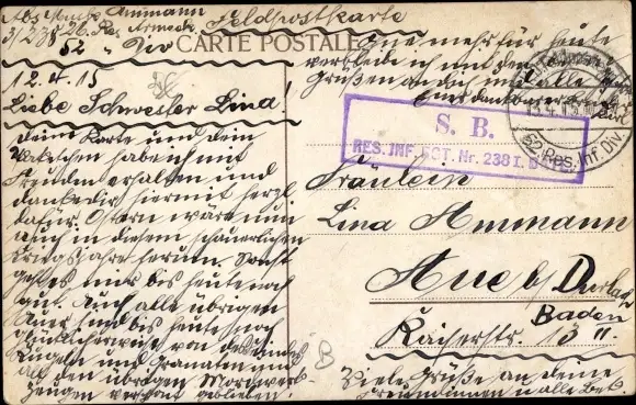Ak Stempel Deutsche Feldpost 1. WK, 52. Res. Inf. Div., Res. Inf. Regt. Nr. 238 I. Batl.