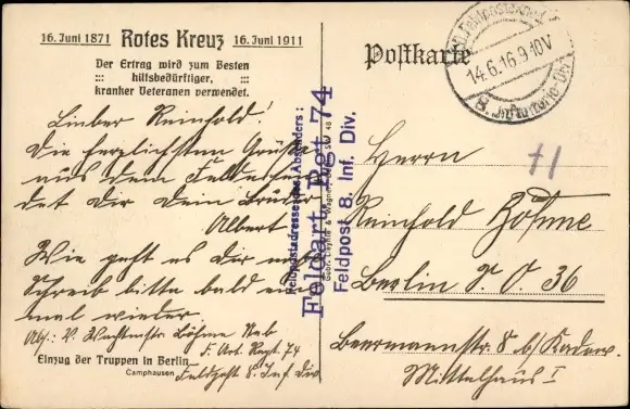 Ak Stempel Deutsche Feldpost 1. WK, 8. Inf. Div., Feldart. Regt. 74