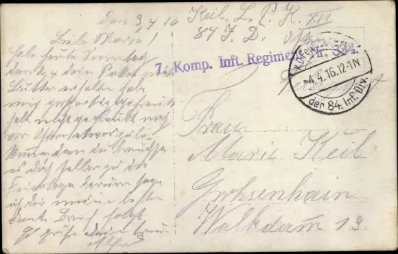 Ak Stempel Deutsche Feldpost 1. WK, 84. Inf. Div., 7. Komp. Inft. Regiment Nr. 334