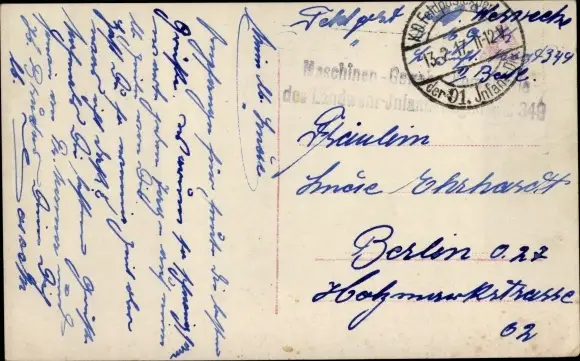 Ak Stempel Deutsche Feldpost 1. WK, 91. Inf. Div., Maschinen Gewehr Komp., Landwehr Inf. Regt. 349
