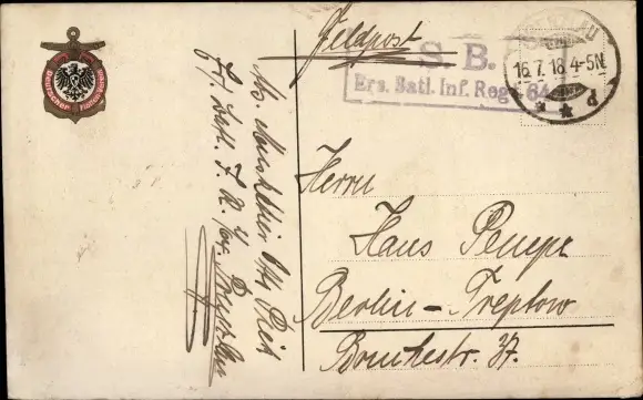 Ak Stempel Deutsche Feldpost 1. WK, Ersatz-Batl.-Infanterie-Regiment 64, Wappen
