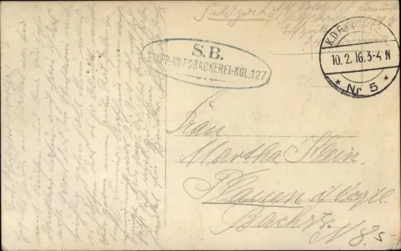 Ak Stempel Deutsche Feldpost 1. WK, Feldpoststation Nr. 5, Etapp. Hilfsbäckerei Kol. 127