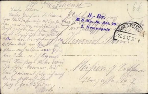 Ak Stempel Deutsche Feldpost 1. WK, K. S. Mg. S. Abt. 76, 1. Kompagnie