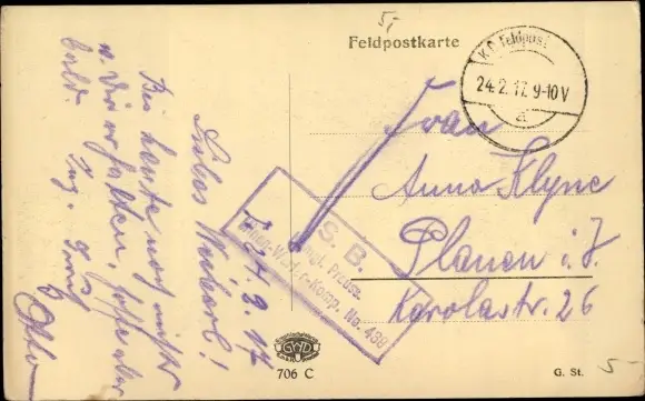 Ak Stempel Deutsche Feldpost 1. WK, Königl. Preuss. Minen Werfer Komp. No. 439