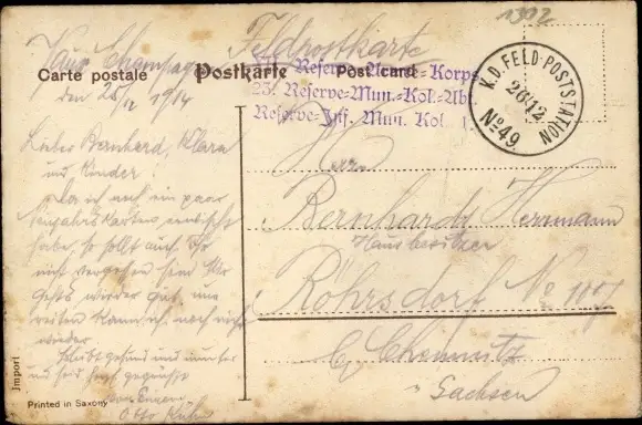 Ak Stempel Deutsche Feldpost 1. WK, XII. Res. Armee Korps 23. Res. Mun. Kol. Abt. Res.Inf. Mun.Kol.1