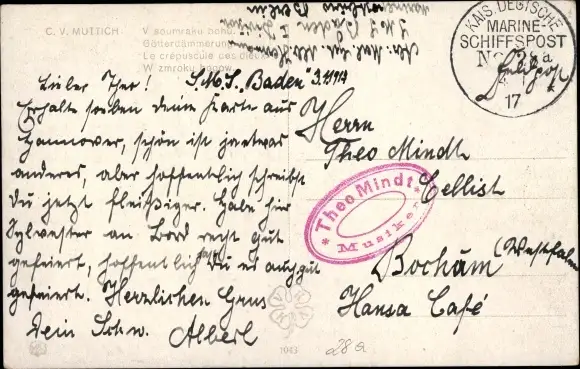 Ak Stempel Marinepost MSP Nr. 28a, Linienschiff SMS Baden II