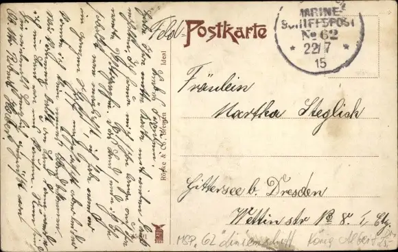 Ak Stempel Marinepost MSP Nr. 62, Linienschiff SMS König Albert