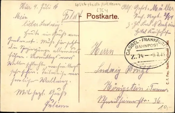 gelaufen als Bahnpost 1916, Kassel Frankfurt Main Zug 74, sehr guter Zustand