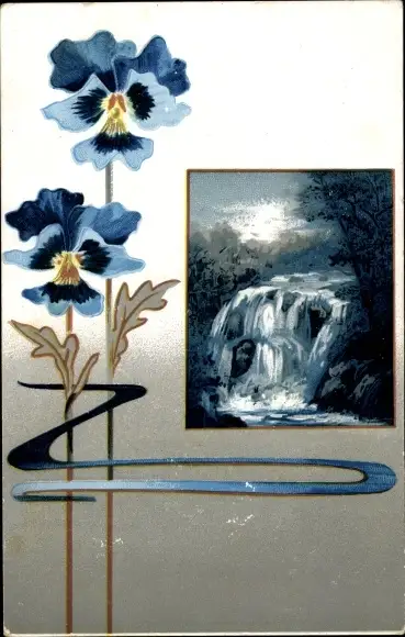 Ak Stiefmütterchen, Wasserfall bei Nacht, Mondschein