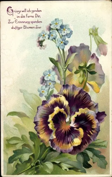 Ak Stiefmütterchen und Vergissmeinnicht, Grüße will ich senden in die Ferne Dir