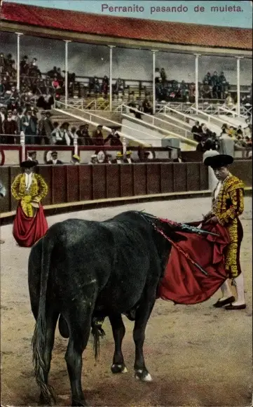 Ak Stierkampf, Toreros und verwundeter Stier in der Arena