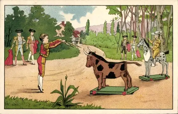 Ak Stierkampfszene, Stier und Pferd auf Rollen, Spielzeuge