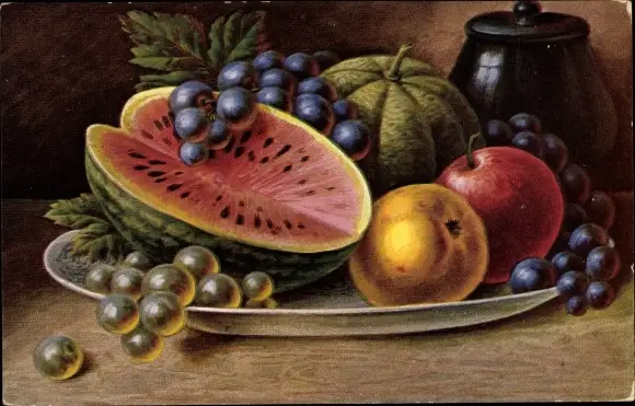 Ak Stillleben, Obst, Früchte, Wassermelone, Weintrauben, Apfel