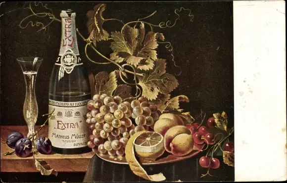 Ak Stillleben mit Sektflasche und Obst, Weintrauben, Zitrone, Matheus Müller