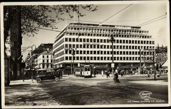 Ak Stockholm Schweden, Norrmalmstorg, Straßenbahn