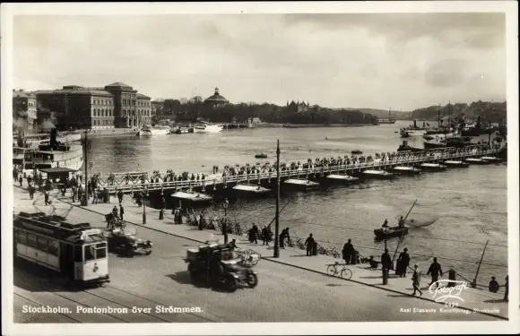 Ak Stockholm Schweden, Pontonbron över Strömmen, Straßenbahn