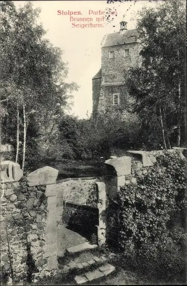 Ak Stolpen in Sachsen, Partie am Brunnen mit Seigerturm