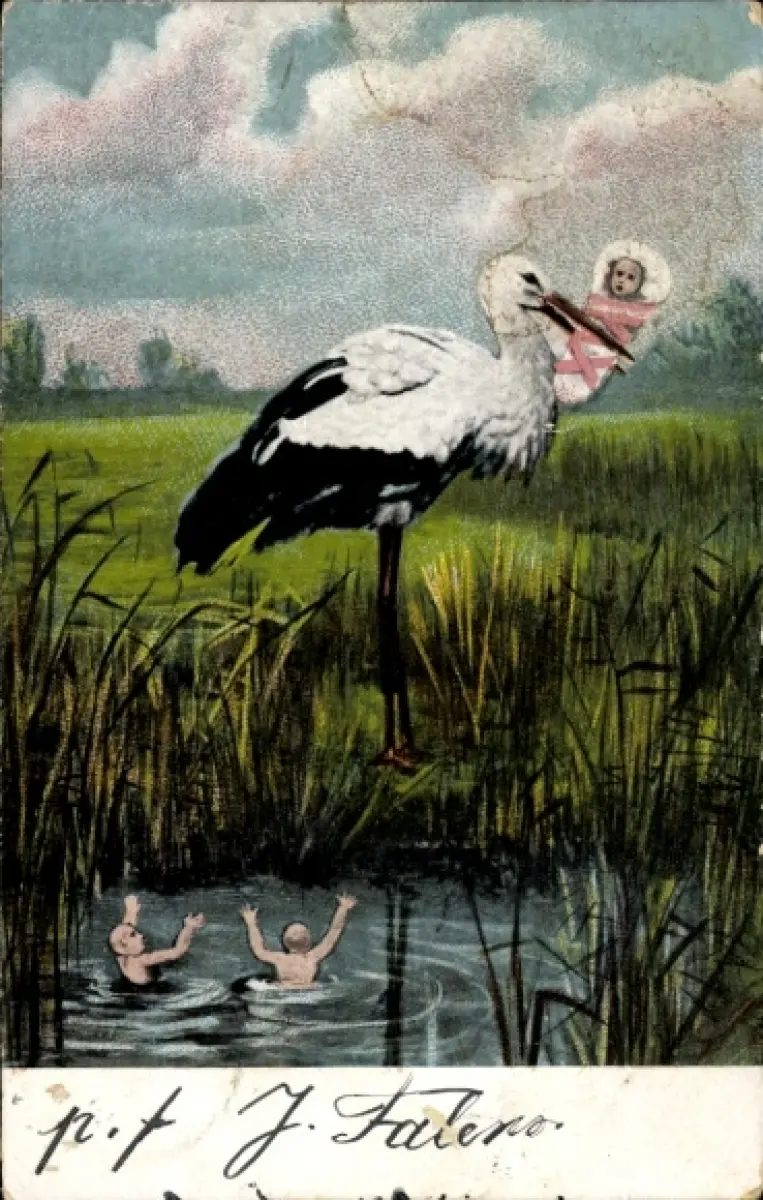 Ak Storch mit Kind im Schnabel, Kinder im Teich