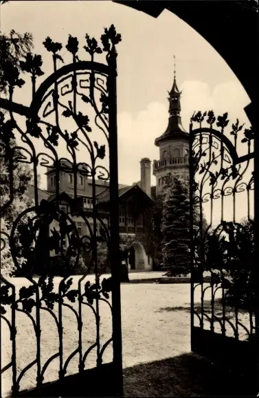 Ak Storkow in der Mark, Fischereischule Hubertushöhe, Blick durch Metalltor